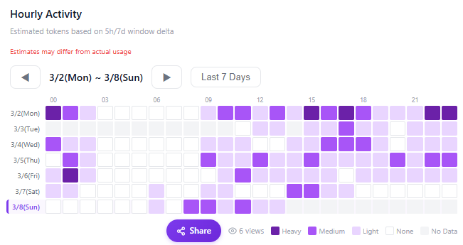 - 24-hour × date heatmap — Visually identify which hours you use Claude the most