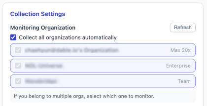 If you use two or more organizations, you can choose which ones to track in the extension options. Currently, up to 3 organizations can be tracked simultaneously, and all organizations are collected by default if you have 3 or fewer. However, if you have organizations you don't actively use, please exclude them from collection.