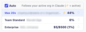 - Auto mode: When Auto is checked, the organization you're currently using in Claude is automatically set as your main (primary) organization. When you switch organizations in Claude, your main follows automatically.
