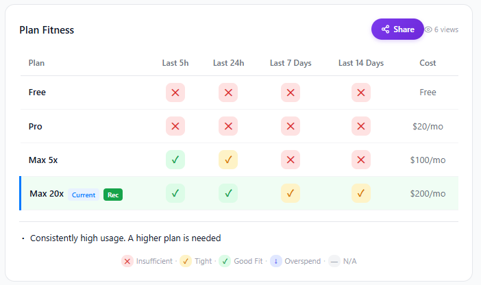 - Fitness score per plan — See at a glance how well Pro, Max 5x, and Max 20x fit your usage