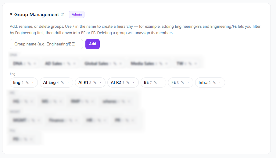 - Team Dashboard → Settings tab → Group Management