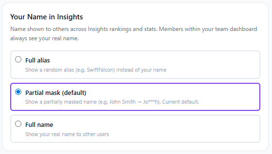 - Full alias — Display a random English alias (e.g. SwiftFalcon). Full anonymity. Editable and regenerable.