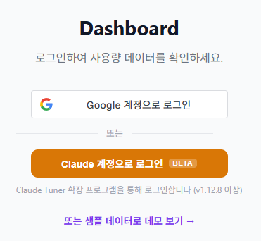Claude Tuner 확장 프로그램(v1.12.8 이상)이 설치되어 있고, Claude.ai에 로그인된 상태라면 로그인 화면에서 "Claude 계정으로 로그인" 버튼이 표시됩니다.