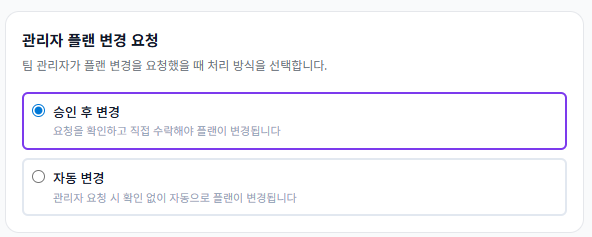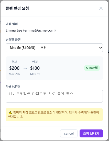 관리자가 멤버에게 직접 플랜 변경을 요청할 수 있습니다.