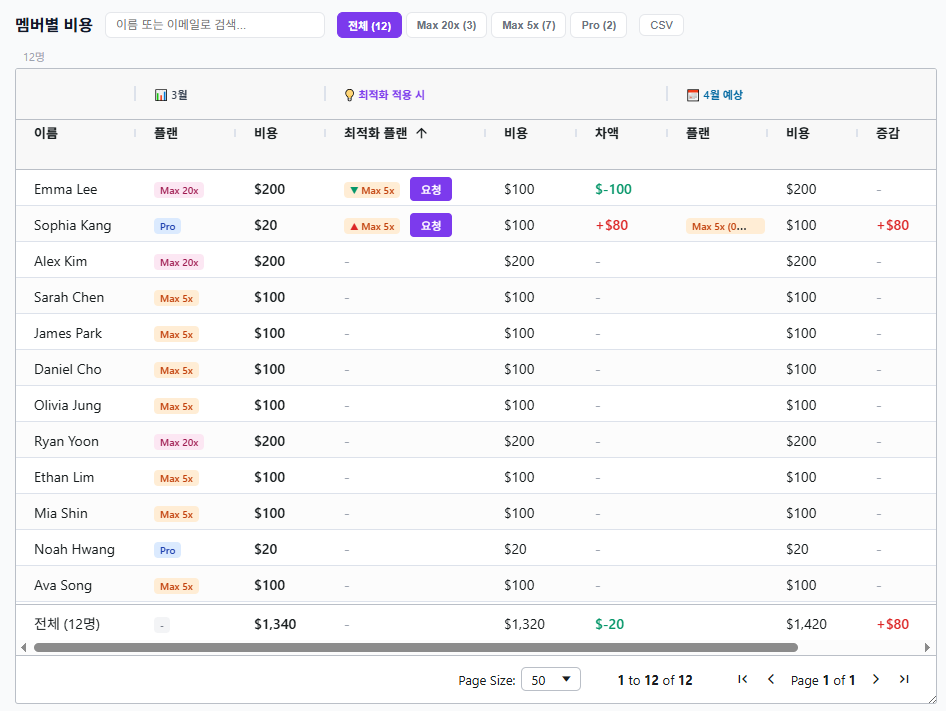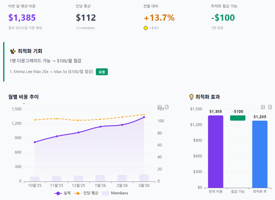 - 멤버별 비용 테이블: 현재 비용, 최적화 플랜, 다음 달 예상 비용을 한눈에 비교