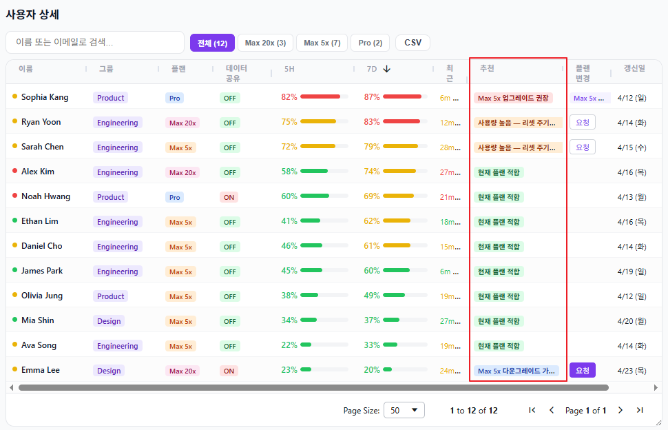 - 개인 대시보드의 플랜 적합도 매트릭스에서도 각 플랜별 적합도를 확인할 수 있습니다 (사용 데이터와 평가 방식이 다르므로 팀 대시보드 추천과 결과가 다를 수 있습니다)
