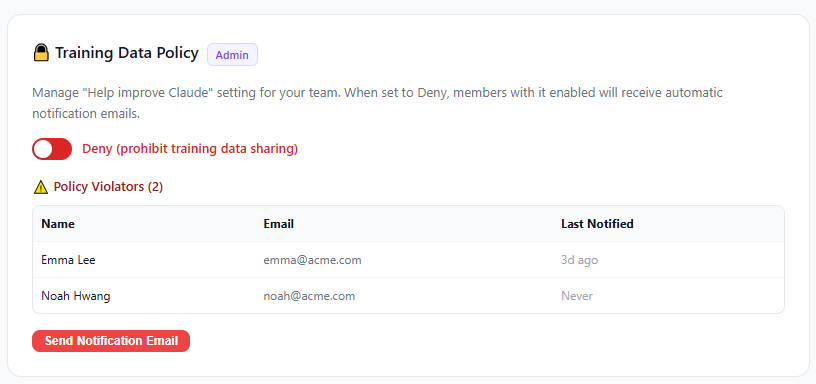 조직 관리자가 팀 멤버의 Claude "학습 데이터 공유(Help improve Claude)" 설정을 한눈에 모니터링하고, 정책 위반자에게 자동으로 알림을 보낼 수 있습니다.