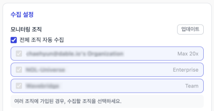 두 개 이상의 조직을 사용하는 경우, 확장 프로그램 옵션에서 수집을 원하는 조직을 선택할 수 있습니다. 현재 최대 3개 조직의 데이터를 수집할 수 있으며, 3개 이하라면 기본적으로 모든 조직이 수집됩니다. 다만 실제로 사용하지 않는 조직이 있다면, 해당 조직은 수집에서 제외해 주시기 바랍니다.