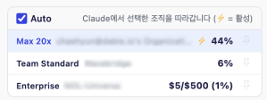 - Auto 모드: Auto를 체크하면 Claude에서 본인이 현재 선택한 조직이 자동으로 메인(primary)으로 설정됩니다. 조직을 전환하면 메인도 자동으로 따라갑니다.
