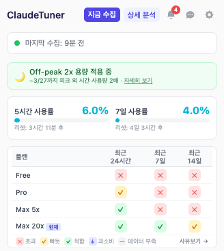 - Claude Tuner의 사용률 게이지에 이미 반영되어 표시됩니다.