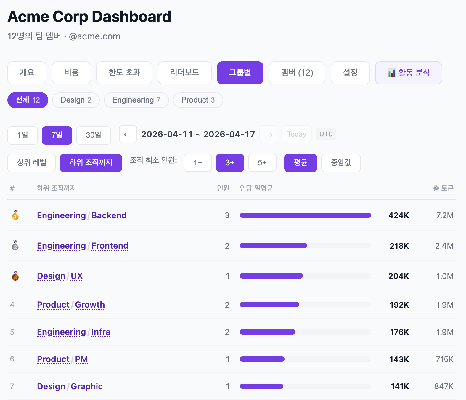 조직 내 팀/부서별 Claude 사용량을 한눈에 비교할 수 있습니다.